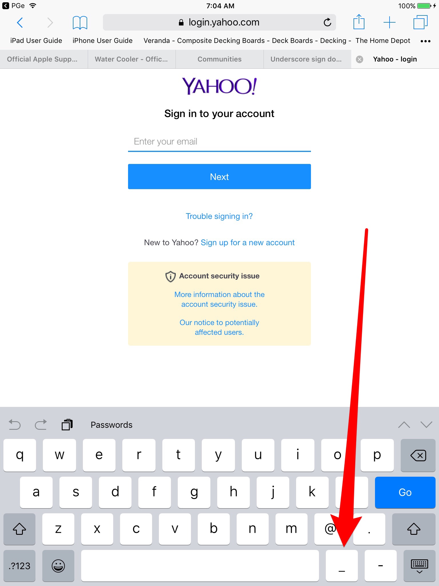 If you need to place an underscore while typing an email contact address, you should hold the shift button down and then press the button on the right of .